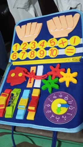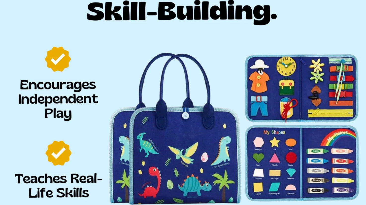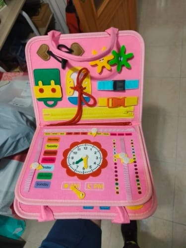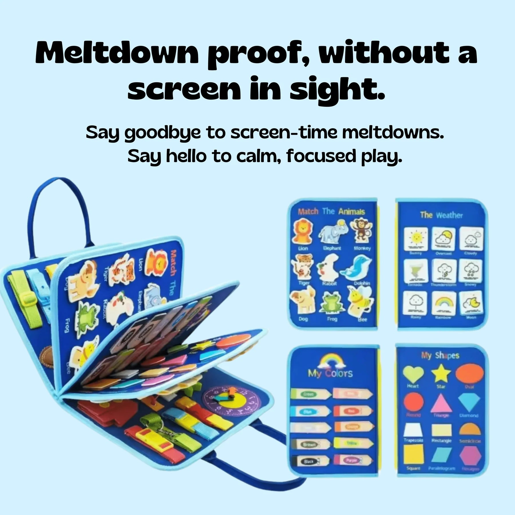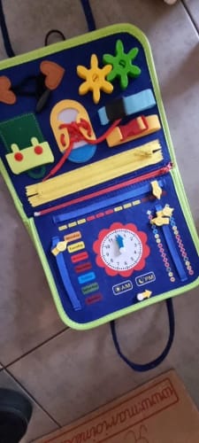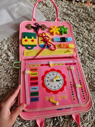 The busy board measures 28 × 25 cm (≈11 × 9.8 inches) and weighs just 0.77 lbs (0.35 kg). It’s lightweight, slim, and designed to fit easily into most diaper bags or school bags — making it the perfect travel companion for road trips, flights, or everyday outings.